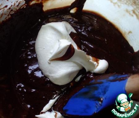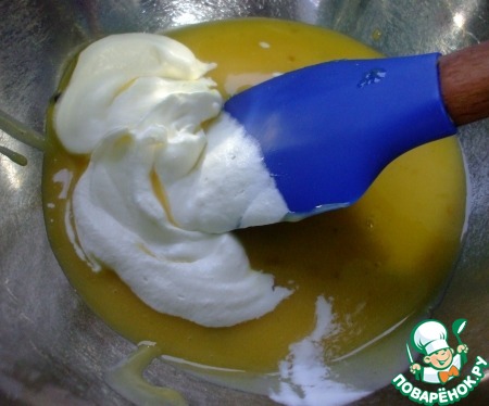 Добавить взбитый яичный белок, в несколько приемов, очень аккуратно перемешивая лопаткой, стараясь не повредить пузырьки воздуха. От этого шага будет зависеть качество бисквита.