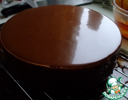 Торт перед глазированием хорошо охладить. Можно даже слегка заморозить в морозильной камере. А глазурь остудить до 24С –горячую глазурь на торт выливать нельзя. Почему, у Оленьки отлично описано, не буду повторяться. Торт поставить на решетку, помешенную над небольшим противнем. Противень я обычно застилаю куском пищевой пленки, чтобы не мыть….))). Ну, и чтобы глазурь легче было собирать, если надо по второму кругу торт глазировать).