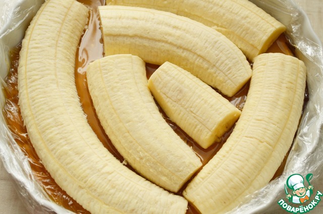 5. После того, как карамель полностью растворилась, жидкость подогреть, растворить в ней желатин. Как только желатин растворится, процедить. Форму 18 см в диаметре застелить пищевой пленкой, вылить половину желе и убрать в холодильник. Как только желе схватится, вынуть. Банан очистить, если крупный, то разрезать на 2 половинки. Затем бананы разложить на желе как на фото.