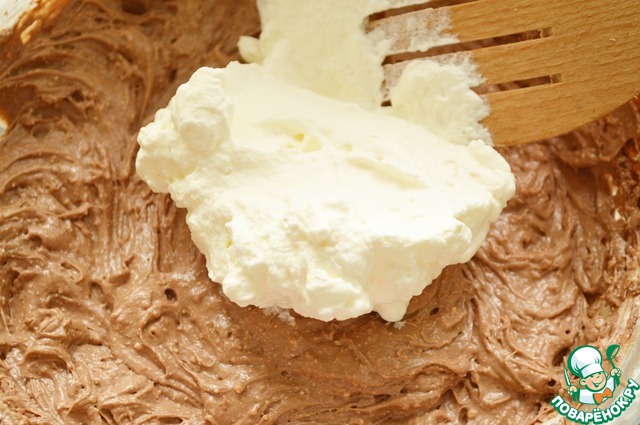 2. Затем ввести шоколад, перемешать лопаткой. Духовку разогреть до 180С. Форму застелить пергаментом, вылить тесто и печь примерно 20-25 минут до сухой лучины. Форма 20 см.