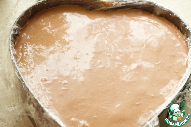 7. Форму застелить пищевой пленкой, выложить бисквит. Для мусса. Сливки взбить в пышный крем. Шоколад растопить на водяной бане. Желатин развести в горячей воде. Творог взбить с сахаром, чтоб сахар растворился. Взбивая добавить не горячий желатин. Затем добавить не горячий шоколад, взбить. Затем аккуратно ввести сливки. Все это нужно делать быстро. так как мусс быстро застывает.
