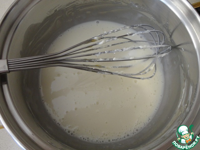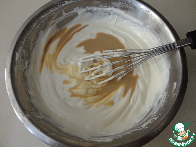 Последним добавляем ликер и хорошенько перемешиваем всю массу, чтобы она стала однородной.