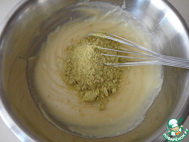 Для основы в миске смешиваем венчиком 125г оливкового масла, 125г вина, 110г сахарной пудры, 200г муки. Добавляем 30г измельченных фисташек и снова хорошенько перемешиваем.
