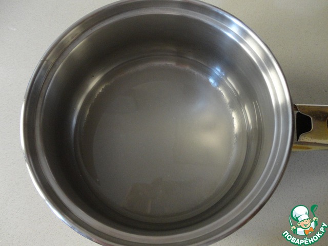 Примерно за 5-10 минут до готовности основы начинаем делать сироп. Для этого смешиваем в кастрюльке 100г сахара и 80г воды. Варим 1 минутку после закипания.