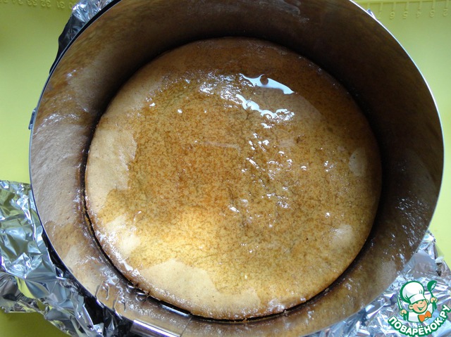 Достаем основу из духовки и выливаем на нее горячий сироп. Оставляем по меньшей мере на 2 часа, чтобы основа остыла и пропиталась.