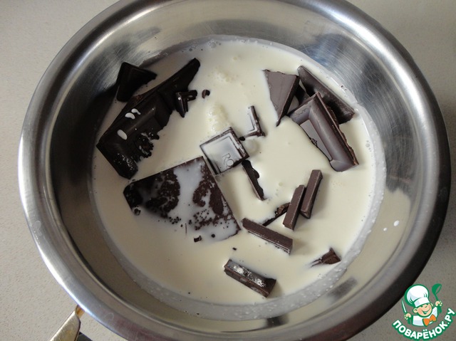 Когда основа будет готова, начинаем делать шоколадный мусс. Для этого подогреваем 200г сливок и выливаем их в миску с 200г горького шоколада. Оставляем на минутку, затем перемешиваем до получения однородной массы.