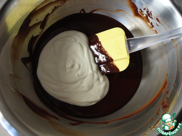 Взбиваем 100г сливок и аккуратно вмешиваем в растопленный шоколад. Делайте это аккуратно, мусс может свернуться.
