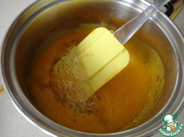 Замоченный желатин отжать и смешать с горячим фруктовым пюре. Размешиваем очень тщательно.