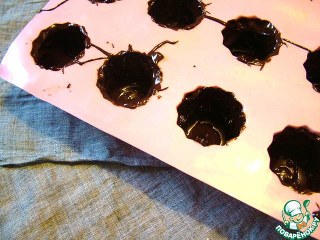 У меня осталось немного мусса, и я решила сделать конфеты. Растопленным шоколадом обмазала изнутри формочки. Остудила в морозилке 5 минут.