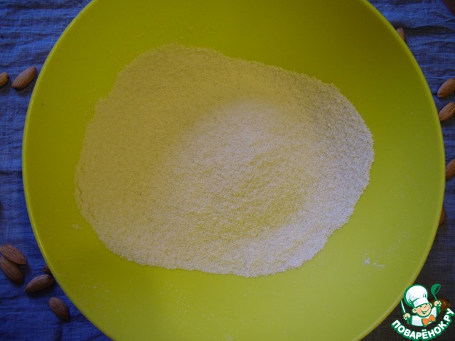 Миндальную муку смешать с сахарной пудрой, просеять через крупное сито. Добавить яйца комнатной температуры и взбивать 10 минут. Масло растопить. Снизить немного скорость и добавить по частям просеянную белую муку и горячее масло в несколько приемов.