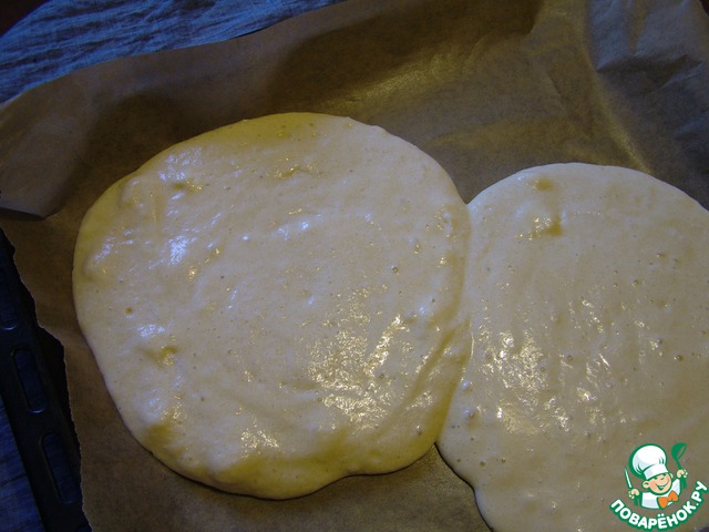Вылить тесто на противень. Печь 10-12 минут. Перевернуть бисквит, снять бумагу