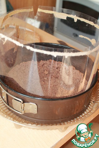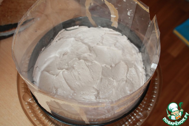 Увеличить бортики разъемной формы (у меня 23 см в диаметре). Я увеличила плотной, пластиковой пленкой с коробки от детской машины. На дно положить корж, пропитать карамельным сиропом.