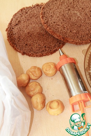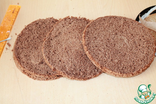 Заранее испечь шоколадный бисквит. Остудить. Разрезать на 3 коржа.