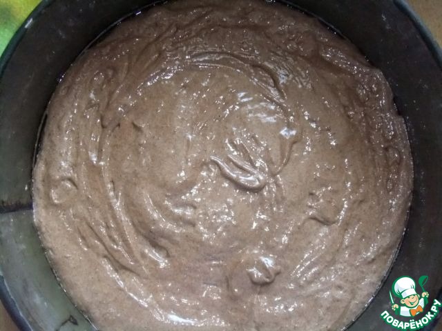 Вылить в застеленную пергаментом форму. У меня диаметром 24 см. Выпекать при 200 гр около 20 минут. Дать остыть.