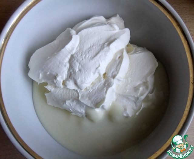 Сметану взбить со сгущеным молоком. Влить растопленный желатин, постоянно перемешивая массу. Оставить, чтобы чуть загустела.