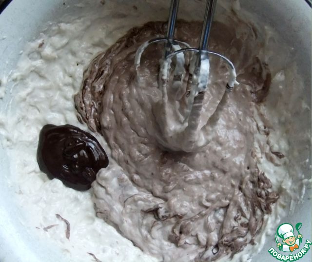 Влить растопленный на водяной бане шоколад, тщательно перемешать. Добавить растопленный желатин, не прекращая перемешивать.