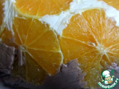 Выложить на дно и по бокам формы кружочки апельсинов. Если будет выступать сок, аккуратно промокнуть его бумажной салфеткой. Осторожно залить желейную массу, поставить в холодильник для застывания.
