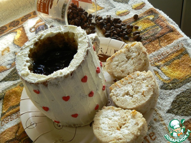 Сварить кофе, добавить в него оставшийся сахар и хорошо перемешать. Вылить к оставшемуся желатину. Дать также немного схватиться и выложить в чашечку. Дать полностью застыть