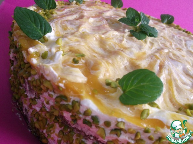 Освобождаем торт от разъёмного кольца, украшаем бока рубленными фисташками, а верх листиками мяты