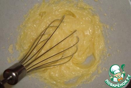Размягченное сливочное масло взбиваем с 100 г сахара и ванилином. Яйца разделяем на желтки и белки, и по одному желтку добавляем к масляной смеси, продолжая взбивать.