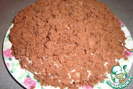 Сверху крошим бисквит, тот что вынимали из серединки. Торт готов, убираем его в холодильник, как минимум на 4 часа, а лучше на ночь. Перед подачей можно посыпать какао