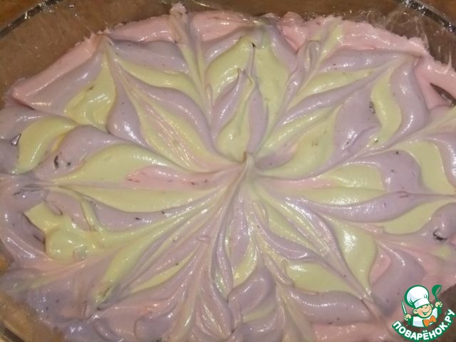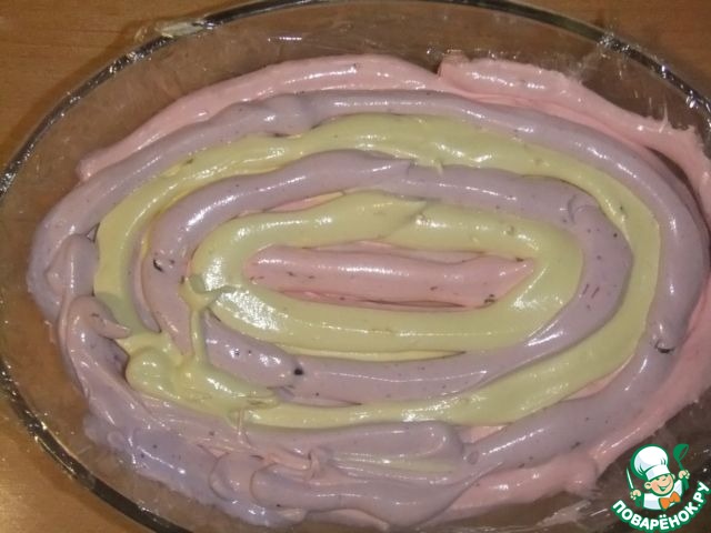 Выдавить по кругу массу, чередуя по цвету, в форму, застеленную пищевой пленкой.