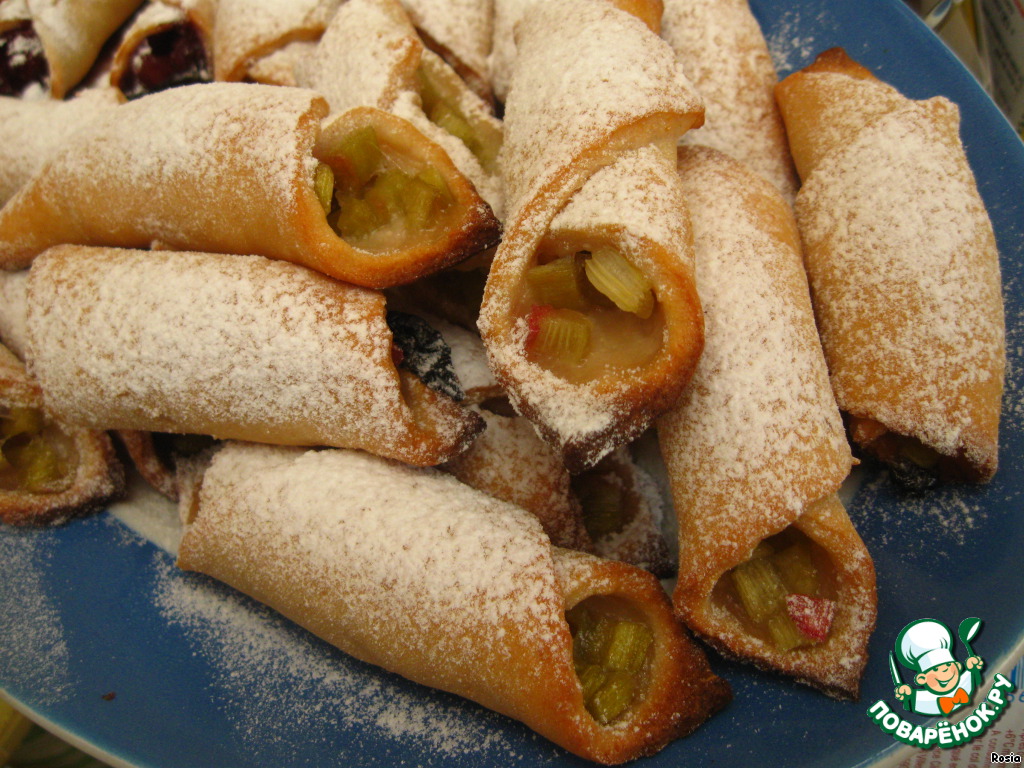 9. Ревень переложить на сито, слегка отжать сок, выложить на каждый квадратик теста.