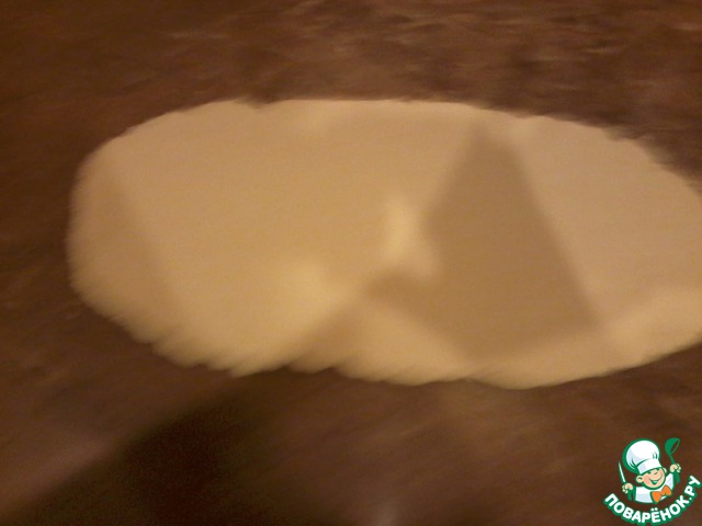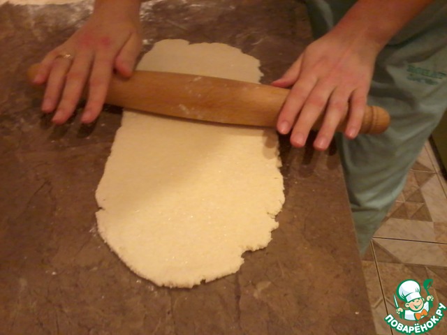 Чтобы тесто не липло к рукам, слегка обмакнуть его в муку. Разделить на 2 части, срезы обмакнуть в муку, раскатать пласт примерно 35 см на 15 см и толщиной ок. 0,5 см.