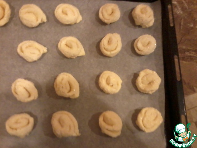 Обмакиваем розочки в сахар и выкладываем на противень, устеленный пергаментом. Розочки выкладываем на расстоянии друг от друга, чтобы при выпечке они не слиплись Отправляем наше печенье в разогретую до 180 градусов духовку на 15-20 минут.