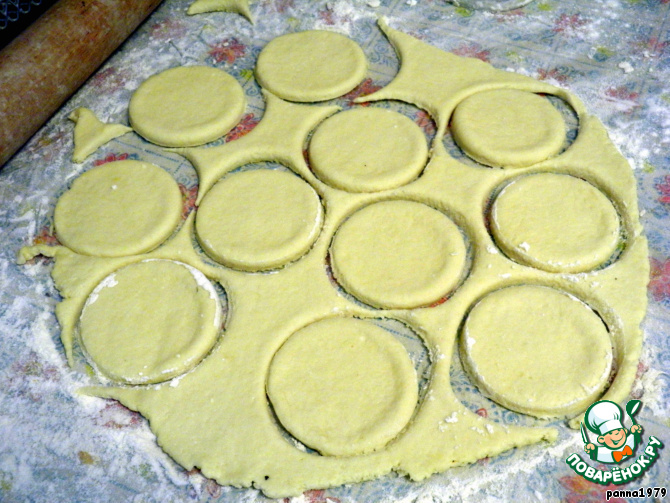 Тесто тонко раскатываем и стаканом или формочкой вырезаем кружки (диаметр примерно 5-6 см).