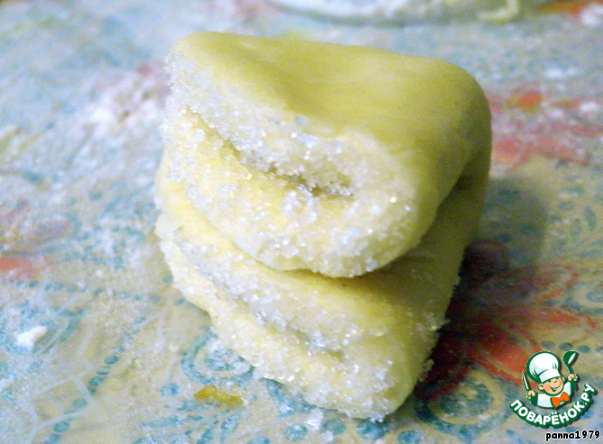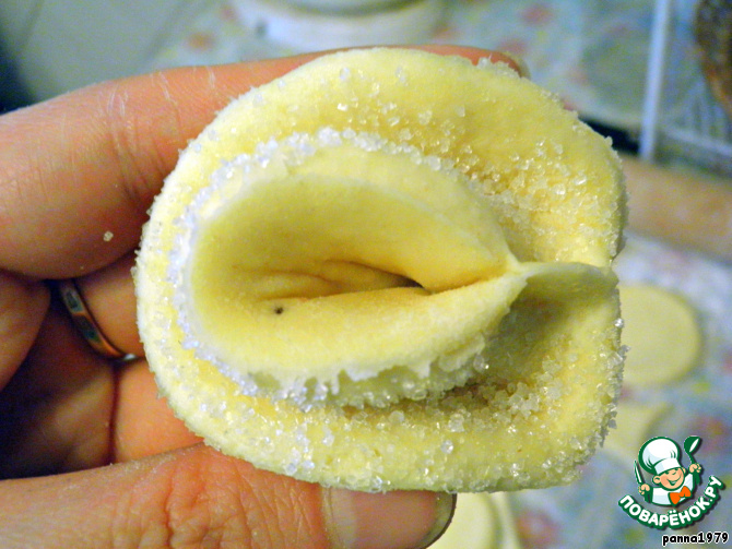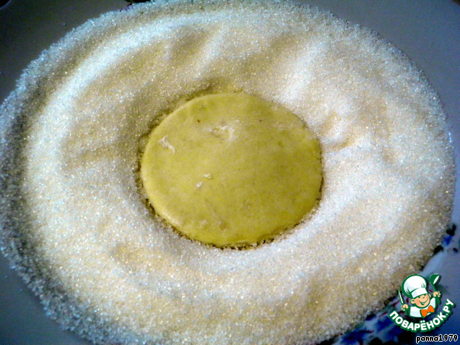 В тарелку насыпаем толстым слоем сахар. Берем кружок теста и укладываем его одной стороной на сахар, слегка прижимаем для закрепления на нем сахара.