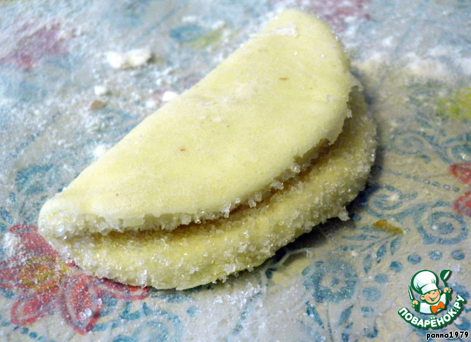 Теперь складываем кружок пополам, стороной с сахаром внутрь.