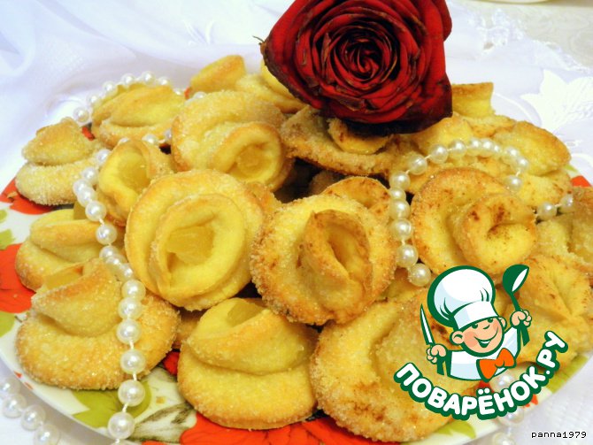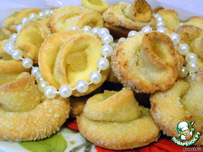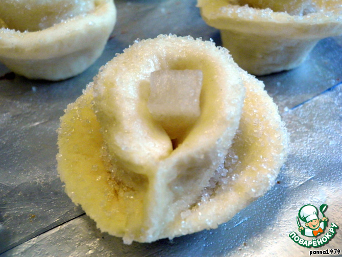 В серединку "розы" я положила ананасовый цукат, он выполняет роль бутона. Цукаты лучше перед этим залить кипятком и дать постоять минут 5, чтобы при выпечке они остались сочными.