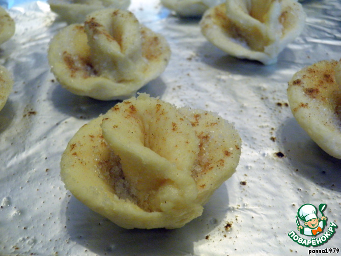Выкладываем заготовки наших роз на смазанный противень и расправляем "лепестки". Особо усердствовать с этим не стоит, так как во время выпечки тесто немного "поплывет", и они раскроются сами собой, а вот скрепить слои нужно как можно лучше, иначе роза совсем потеряет свою форму.