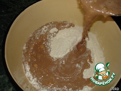 Влить полученную жидкость в миску с мукой. Тщательно размешать.