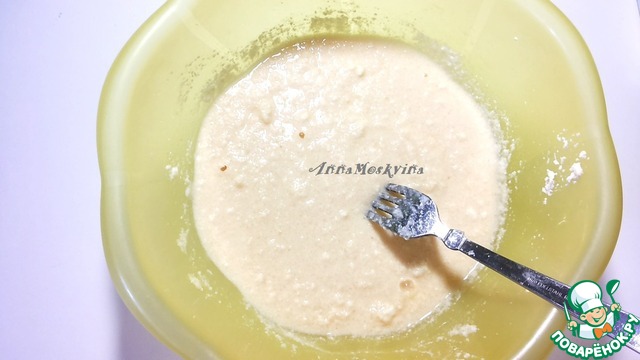 Все тщательно перемешиваем, должна получится жидковатая консистенция + если Вы добавляете соду, то ее надо добавить на этом этапе, не забыв погасить ее уксусом...