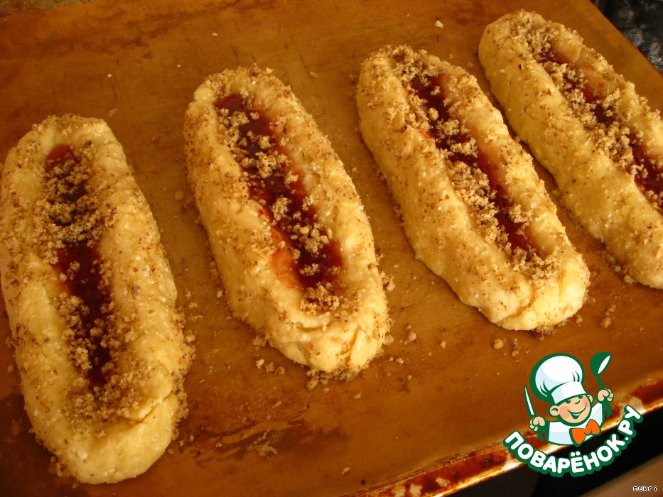 Заполнить джемом всю длину углубления в бисквитах. Затем смазать поверхность взбитым белком и посыпать ореховой крошкой сверху (см. фото)