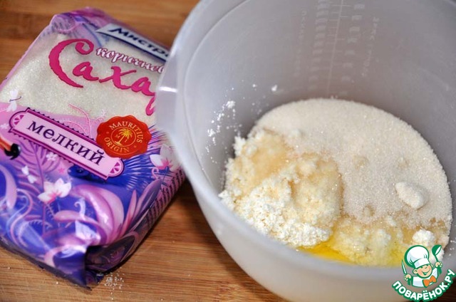 Берём творог (у меня 5%), добавляем сахар мелкий коричневый от "Мистраль", яйцо и всё взбиваем миксером до однородности.