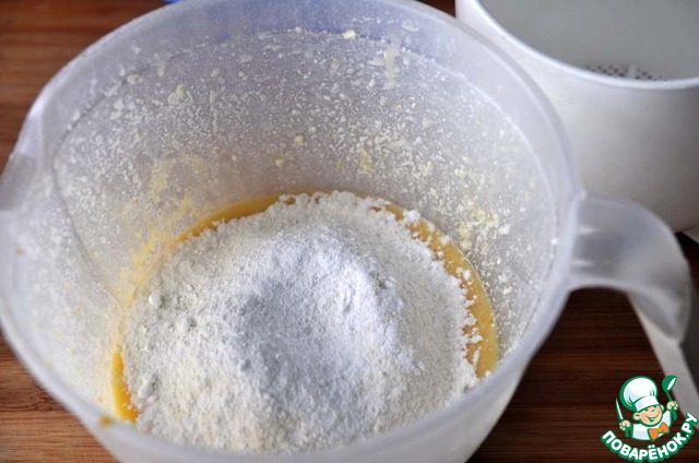 Добавляем просеянную муку, разрыхлитель. Перемешиваем.