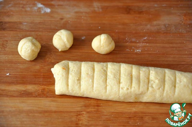 Из теста делаем колбаску, делим на ровные кусочки (около 20 г), делаем "колобки".
