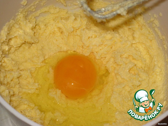 Размягченный маргарин взбить с сахаром, добавить яйцо, взбить.