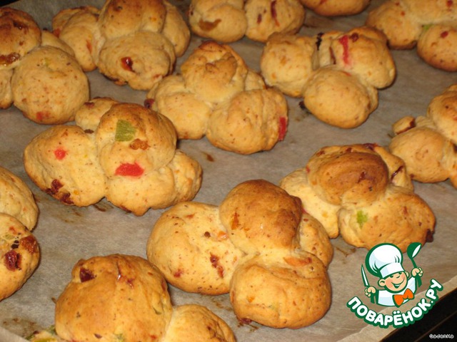 | Название печенья из-за формы, думала сделать одной формы, но в последний момент руки сами сделали вот так. Само тесто из творога, сыра и молотого миндаля, ароматизируем апельсиновой цедрой, для особой вкусности и чтобы не скучно было добавим цукаты, вяленую черешню и изюм. Структура печенюшек мягкая и плотная, вкусное до безобразия, больше всего понравилось мне на 3 -й день после выпечки, оно становится более насыщенное и ароматное. |