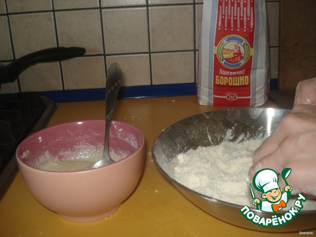 Добавляем творожную смесь в мучную и замешиваем мягкое тесто. На 30 минут отправляем его в холодильник.