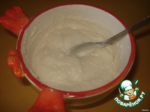 Для начинки растереть творог с сахаром, взбитым белком, кокосовой стружкой и крахмалом.