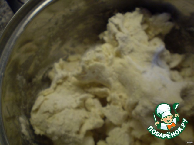 Начинаем делать тесто. Творог, масло и муку смешать руками.