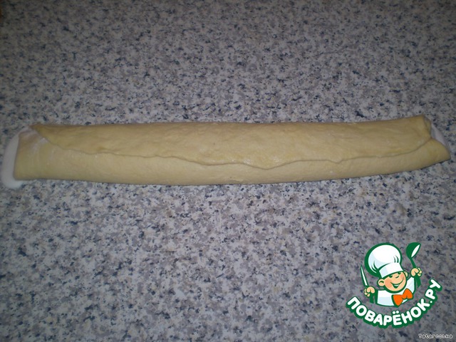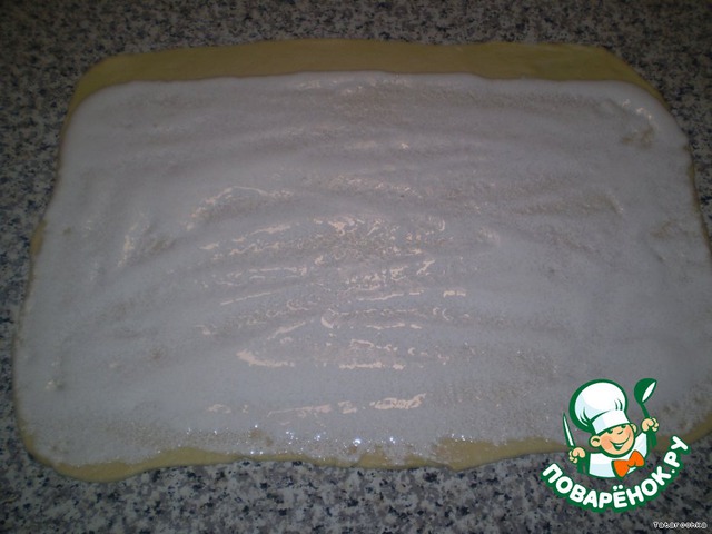 Тесто разделить на 2 части, сформовать прямоугольник и раскатать до толщины 2-3 мм.