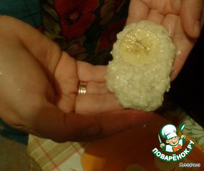 Из кусочка теста смоченными водой руками делаем лепешечку и кладем внутрь ломтик банана.