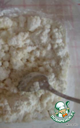 Яйца, сахар, творог, ванилин, цедра, мука и крахмал перемешиваются, добавляется гашеная сода. Тесто получается липкое, поэтому его надо немного охладить перед разделываением.