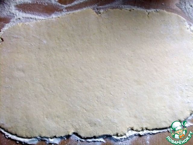 Раскатать тесто тонким слоем на столе, присыпанном мукой.