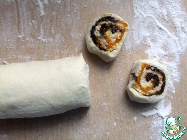 Скрутить тесто в рулет и нарезать на колечки-улитки.